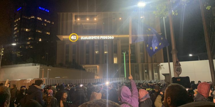 “ოცნების” ოფისში იმყოფებიან მმართველი პარტიის წევრები და ისინი შენობიდან ადევნებენ თვალს მიმდიანრე პორტესტს.