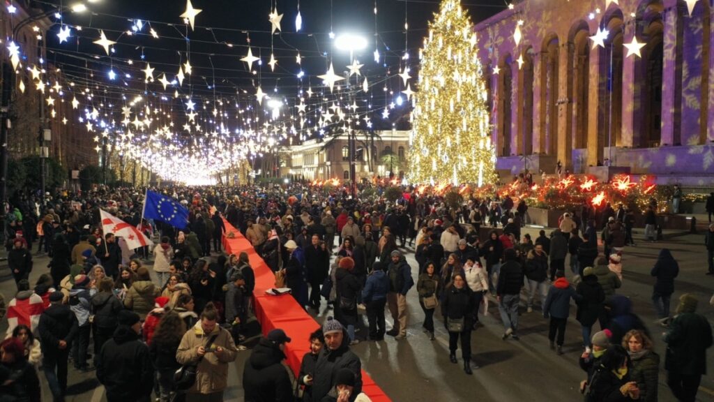 რუსთაველის გამზირზე, პარლამენტის შენობის მიმდებარედ, ახალი წლის ღამეს ათასობით ადამიანი ერთად შეხვდა ახალ წელს.