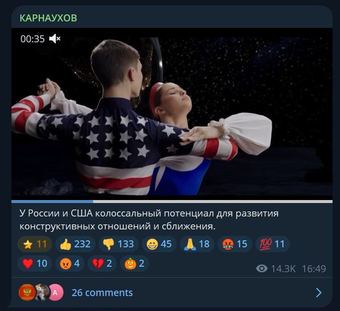 პროპაგანდისტული პროგრამის Соловьев LIVE წამყვანმა სერგეი კარნაუხოვმა გამოაქვეყნა ტრამპი-პუტინის შეხვედრისადმი მიძღვნილი ვიდეორგოლი, სახელწოდებით, „ჩვენ ერთად შევქმნით მომავალს“ (Вместе мы создадим будущее).
