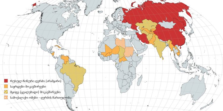 ამ ჯერ კიდევ ჩამოუყალიბებელი ღერძის მთელი მინუსი ისაა, რომ მისი წევრები ერთმანეთის მეტოქეებიც არიან, თუმცა მოკლე ვადაში ურთიერთმტრობისათვის თავის არიდებას ცდილობენ დასავლეთის პოლიტიკური, კულტურული და ფინანსური დომინაციის გასანეიტრალებლად. ამ ღერძს რეალური ფორმირებისათვის წინ არაერთი გამოცდის ჩაბარება მოუწევს. წითელი ფერით ის ქვეყნებია აღნიშნული, რომლებიც ამ ღერძის მთავარ ძალას წარმოადგენენ: რუსეთი, ჩინეთი, ბელარუსი, ირანი და ჩრდილოეთ კორეა. ამ ხუთეულიდან სამს ბირთვული იარაღი აქვს, ბელარუსში კი რუსული ბირთვული არსენალია განთავსებული. ნარინჯისფერით მათი მოკავშირე ან მათზე სხვადასხვა მიზეზით დამოკიდებული ქვეყნები არიან წარმოდგენილნი. მათ რიგებში ბევრ სახელმწიფოს დიდი არჩევანი არ აქვს – ზოგი ჩინეთის ვალის მახეშია გაბმული და ზოგიც კრემლის მხარდაჭერაზეა ჩამოკიდებული. მოყვითალო შტრიხებით წარმოდგენილი ქვეყნები რუსულ-ჩინური ღერძის არასტაბილური, ცვალებადი მოკავშირეები არიან, რომლებიც გარემოებების ცვლილებასთან ერთად შეიძლება ამ ღერძის საპირისპირო მხარეს აღმოჩნდნენ, თუმცა ამ მოცემულ მომენტში ამ ღერძის მიზნებს გარკვეულწილად იზიარებენ. იქ სადაც სამოქალაქო ომები მიმდინარეობს რუსეთი ან მოკავშირითაა წარმოდგენილი ან/და ერთ მხარეს იარაღისა და სადაზვერვო ინფორმაციის მიწოდებას ახდენს. ცხადია ეს გამარტივებული რუკაა, მაგრამ საერთაშორისო პოლიტიკაში წარმოდგენილი კონტურების აღქმაში დაგვეხმარება.