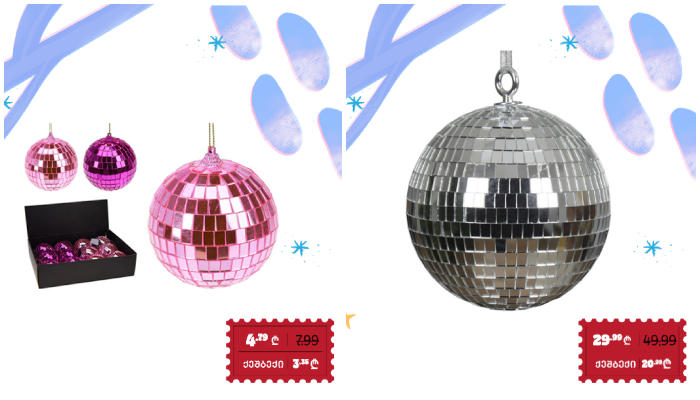 „ბიბლუსის“ წლევანდელი საახალწლო კოლექციაც სწორედ არსებული ტენდენციების და მომხმარებელთა სურვილების გათვალისწინებითაა შერჩეული და რადგან რეტრო ესთეტიკა წელს განსაკუთრებულ ტრენდად გვევლინება, „ბიბლუსის“ ასორტიმენტში იხილავთ ამ სტილის მთავარ სიმბოლოს – დისკოს ბურთებს და სარკეებით გაფორმებულ სხვა ნივთებს, რომელიც სადღესასწაულო განწყობის შესაქმნელად შეუცვლელი აქსესუარი იყო მრავალი წლის განმავლობაში. ბურთები შექმნილია იმისთვის, რომ სინათლის სხივი ყველა მიმართულებით აირეკლოს და გასაკუთრებული ელფერი შესძინოს სივრცეს. წელს დისკოს ბურთები საახალწლო მორთულობის მნიშვნელოვანი ნაწილია. “ბიბლუსის“ საახალწლო კოლექციაში წარმოდგენილია დისკოს ბურთები სხვადასხვა ზომასა (15 სმ-დან 40 სმ-მდე) და ფერში.