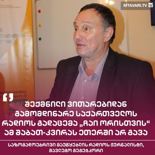 “შექმნილი ვითარებიდან გამომდინარე საქართველოს რადიოს გადაცემა „ჩაი ორისთვის“ ამ შაბათ-კვირას ეთერში არ გავა” | წერს სოციალურ ქსელში საზოგადოებრივი მაუწყებლის რადიოს ჟურნალისტი, შავლეგო გეგეჭკორი.