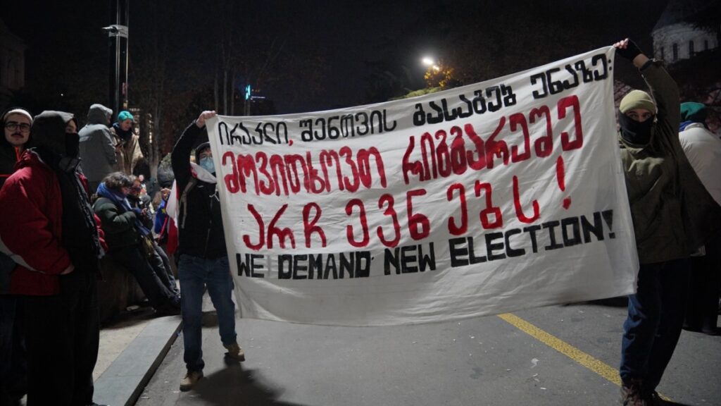 ყოველდღიური აქციები ახალი არჩევნების ჩატარების მოთხოვნით იმართება 28 ნოემბრიდან – მას შემდეგ, რაც „ქართულმა ოცნებამ“ თქვა, რომ მომავალი ოთხი წლის განმავლობაში ევროკავშირში გაწევრიანების მოლაპარაკების საკითხს დღის წესრიგში აღარ დააყენებს.