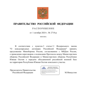 განკარგულების თანახმად, რუსეთის მთავრობა დათანხმდა რუსეთის თავდაცვის სამინისტროს წინადადებას ე.წ. სამხრეთ ოსეთის სამხედრო დეპარტამენტთან “მიწის ნაკვეთის ერთობლივი რუსული სამხედრო ბაზის საკუთრებაში გადაცემის საკითხზე” მოლაპარაკებები დაიწყოს.