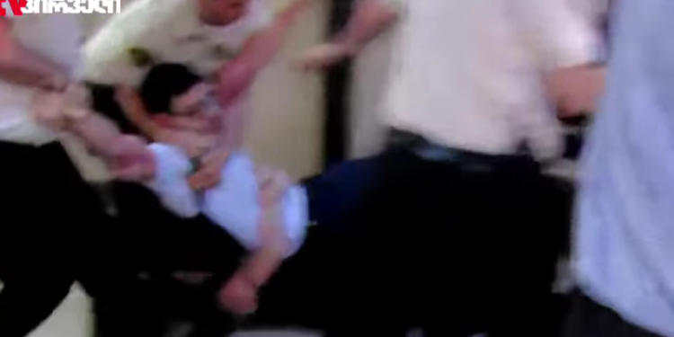 მანდატურები ძალის გამოყენებით ცდილობენ პროცესზე დასწრების მსურველები სასამართლო შენობიდან გამოყარონ.