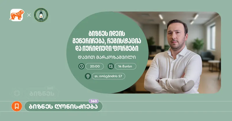 ლექცია განკუთვნილია ყველასთვის, ვისაც საკუთარი ბიზნესის დაწყების გზაზე პირველი ნაბიჯების გადადგმა სურს. შეხვედრის მონაწილეებს წარმოდგენა შეექმნებათ იმ ეტაპებზე, რომლებიც იდეის ბიზნესად გარდაქმნას უძღვის წინ — მათ შორის, იდეის გენერირებას, მის შეფასებას, სტრუქტურირებასა თუ პრაქტიკაში განხორციელებას.