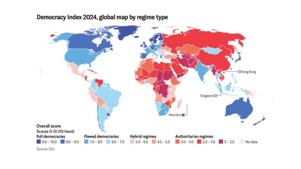 ანალიტიკური კვლევითი ორგანიზაცია The Economist Intelligence Unit-ის 2024 წლის დემოკრატიის ინდექსის თანახმად, რომელსაც ჟურნალი „ეკონომისტი“ აქვეყნებს, საქართველო 4,7 ქულით 94-ე ადგილზე ჩამოქვეითდა.