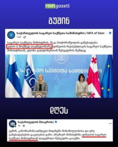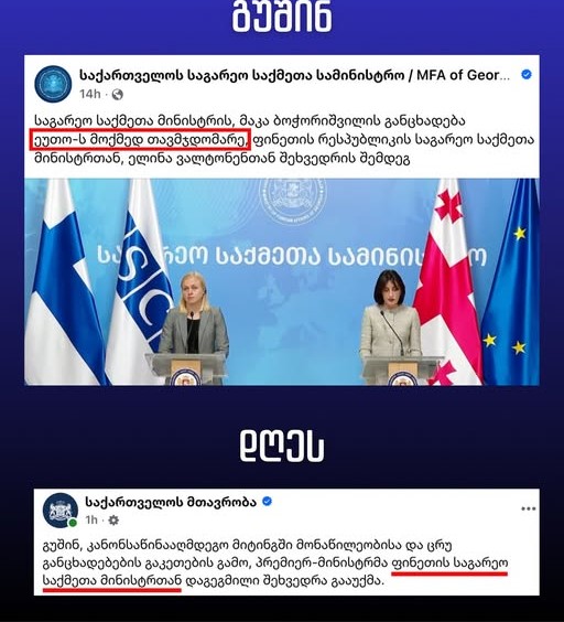 მას შემდეგ, რაც ელინა ვალტონენი საპროტესტო აქციაზე მივიდა და კრიტიკული განცხადებებიც გააკეთა, საქართველოს მთავრობის პოსტში აღარ წერია, რომ ის ეუთოს მოქმედი თავმჯდომარეცაა. ირაკლი კობახიძე მას მხოლოდ ფინეთის საგარეო საქმეთა მინისტრად მოიხსენიებს და საზოგადოებას აცნობებს, რომ მასთან დაგეგმილი შეხვედრა გააუქმა.