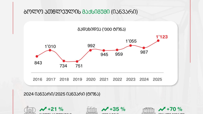 საქართველოს რკინიგზის სატვირთო გადაზიდვების მაჩვენებელი რეკორდულად იზრდება. 2025 წლის იანვარში, კომპანიამ წინა წლის ამავე პერიოდთან შედარებით 14%-ით მეტი – მილიონ ასოცდასამი ათასი ტონა ტვირთი გადაზიდა. ინფორმაციას საქართველოს რკინიგზა ავრცელებს.