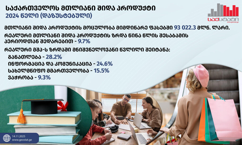 2024 წელს წინა წლის შესაბამის პერიოდთან შედარებით ზრდის მიმართულებით მნიშვნელოვანი წვლილი შეიტანა შემდეგმა დარგებმა: საბითუმო და საცალო ვაჭრობა; ავტომობილების და მოტოციკლების რემონტი (9.3 პროცენტი), ინფორმაცია და კომუნიკაცია (24.6 პროცენტი), განათლება (28.2 პროცენტი), სახელმწიფო მმართველობა და თავდაცვა; სავალდებულო სოციალური უსაფრთხოება (15.5 პროცენტი), სოფლის, სატყეო და თევზის მეურნეობა (13.5 პროცენტი), მშენებლობა (12.2 პროცენტი), ტრანსპორტი და დასაწყობება (11.2 პროცენტი). კლება აღინიშნა ელექტროენერგიის, აირის, ორთქლის და კონდიცირებული ჰაერის მიწოდების სექტორში (10.5 პროცენტი),-აღნიშნულია ინფორმაციაში.