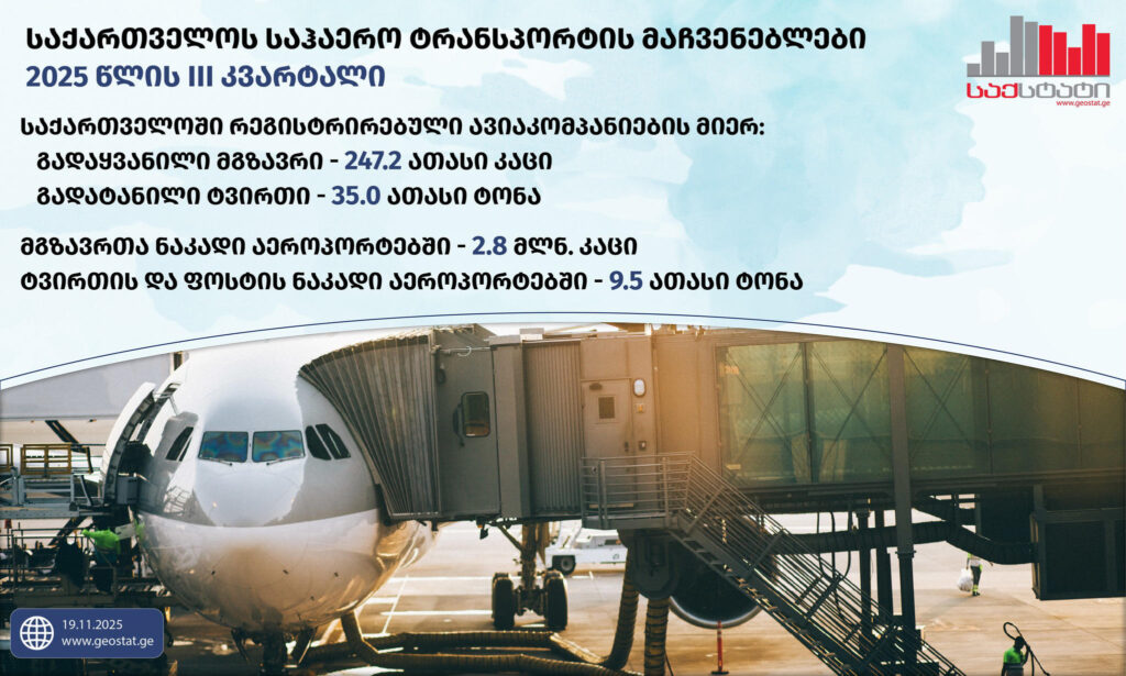 2025 წლის III კვარტალში საქართველოს აეროპორტებში 0.9 ათასი სატვირთო რეისი განხორციელდა, რაც 82.7 პროცენტით აღემატება წინა წლის შესაბამის მაჩვენებელს.