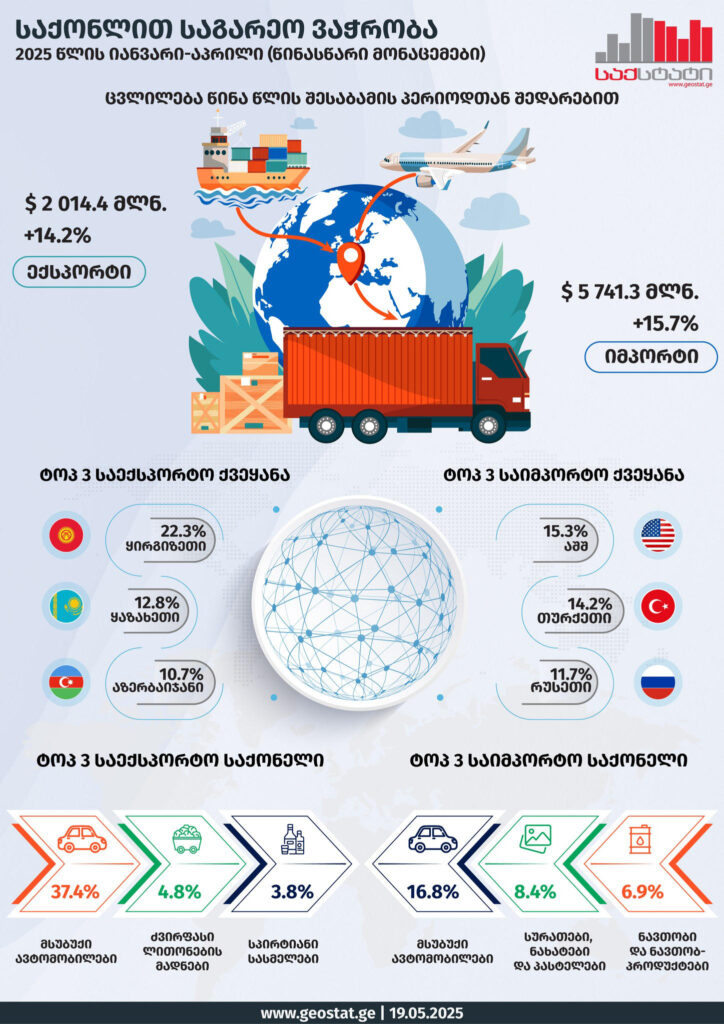 „2025 წლის იანვარ-აპრილში ათი უმსხვილესი ქვეყნის წილმა საქართველოს მთლიან ადგილობრივ ექსპორტში 68.9 პროცენტი შეადგინა. ამ მხრივ, უმსხვილესი საექსპორტო პარტნიორებია: რუსეთი (173.4 მლნ. აშშ დოლარი), თურქეთი (87.9 მლნ. აშშ დოლარი) და ჩინეთი (77.8 მლნ. აშშ დოლარი).