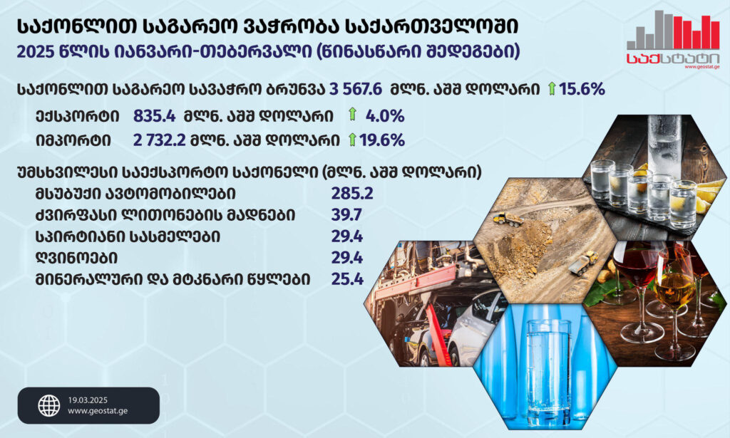საქართველოს სტატისტიკის ეროვნული სამსახურის ინფორმაციით, 2025 წლის იანვარ-თებერვალში საქართველოში საქონლით საგარეო სავაჭრო ბრუნვამ (არადეკლარირებული ვაჭრობის გარეშე) 3 567.6 მლნ. აშშ დოლარი შეადგინა, რაც წინა წლის შესაბამის პერიოდთან შედარებით 15.6 პროცენტით მეტია.