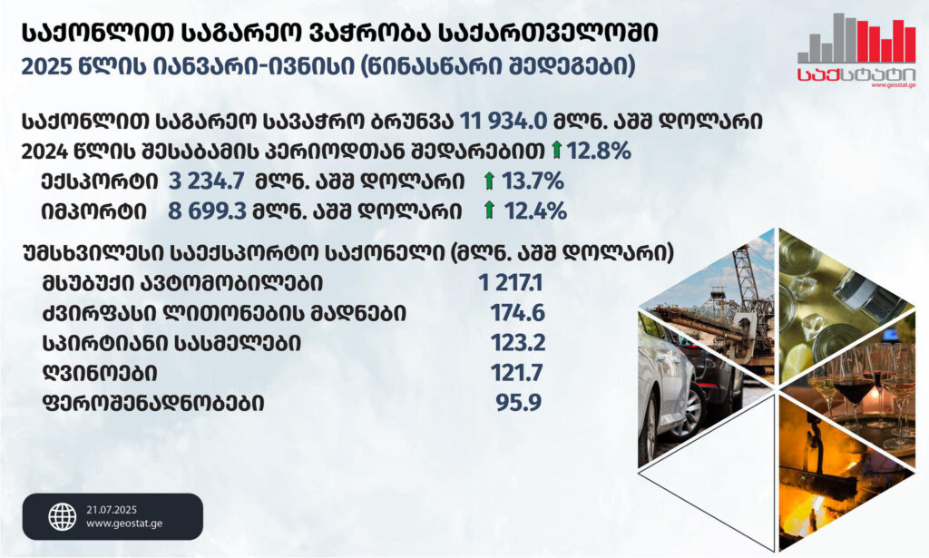 საქართველოს სტატისტიკის ეროვნული სამსახურის ინფორმაციით, 2025 წლის იანვარ-ივნისში საქართველოში საქონლით საგარეო სავაჭრო ბრუნვამ (არადეკლარირებული ვაჭრობის გარეშე) 11 934.0 მლნ. აშშ დოლარი შეადგინა, რაც წინა წლის შესაბამის პერიოდთან შედარებით 12.8 %-ით მეტია.