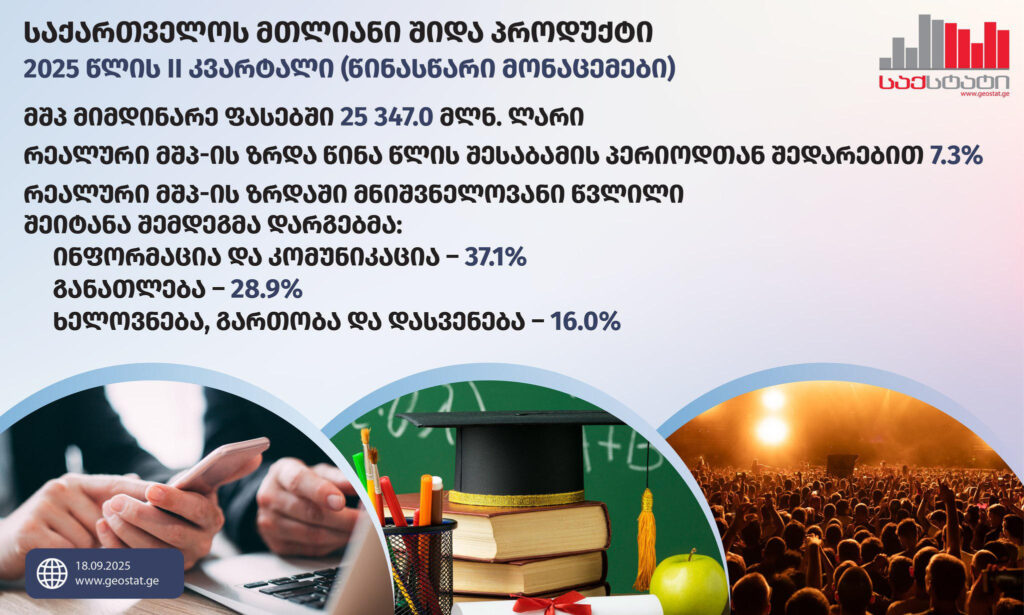 საქსტატის მონაცემებით, 2025 წლის მეორე კვარტალში, ზრდის მიმართულებით მნიშვნელოვანი წვლილი შეიტანა შემდეგმა დარგებმა: ინფორმაცია და კომუნიკაცია (37.1 პროცენტი), განათლება (28.9 პროცენტი), ხელოვნება, გართობა და დასვენება (16.0 პროცენტი), სახელმწიფო მმართველობა და თავდაცვა; სავალდებულო სოციალური უსაფრთხოება (9.1 პროცენტი), საფინანსო და სადაზღვევო საქმიანობები (11.8 პროცენტი), ჯანდაცვა და სოციალური მომსახურების საქმიანობები (14.3 პროცენტი), განთავსების საშუალებებით უზრუნველყოფის და საკვების მიწოდების საქმიანობები (8.4 პროცენტი).