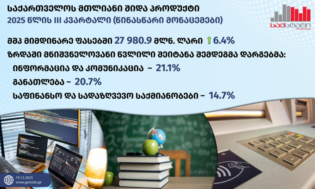 „2025 წლის მესამე კვარტალში, ზრდის მიმართულებით მნიშვნელოვანი წვლილი შეიტანა შემდეგმა დარგებმა: ინფორმაცია და კომუნიკაცია (21.1 პროცენტი), განათლება (20.7 პროცენტი), საფინანსო და სადაზღვევო საქმიანობები (14.7 პროცენტი), სახელმწიფო მმართველობა და თავდაცვა; სავალდებულო სოციალური უსაფრთხოება (9.7 პროცენტი), ტრანსპორტი და დასაწყობება (8.1 პროცენტი), ხელოვნება, გართობა და დასვენება (13.0 პროცენტი), საბითუმო და საცალო ვაჭრობა; ავტომობილების და მოტოციკლების რემონტი (3.0 პროცენტი).