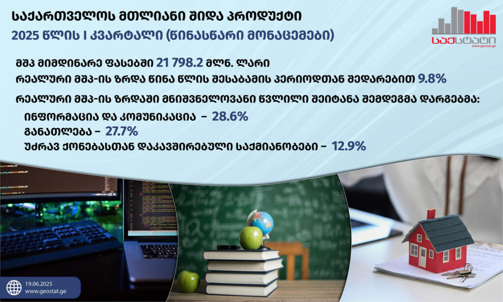 საქართველოს სტატისტიკის ეროვნული სამსახურის ინფორმაციით, 2025 წლის I კვარტალში მთლიანი შიდა პროდუქტის მოცულობა მიმდინარე ფასებში 21 798.2 მლნ. ლარს გაუტოლდა, ხოლო წინა წლის შესაბამის პერიოდთან შედარებით რეალური მთლიანი შიდა პროდუქტის ზრდამ 9.8 პროცენტი შეადგინა.
