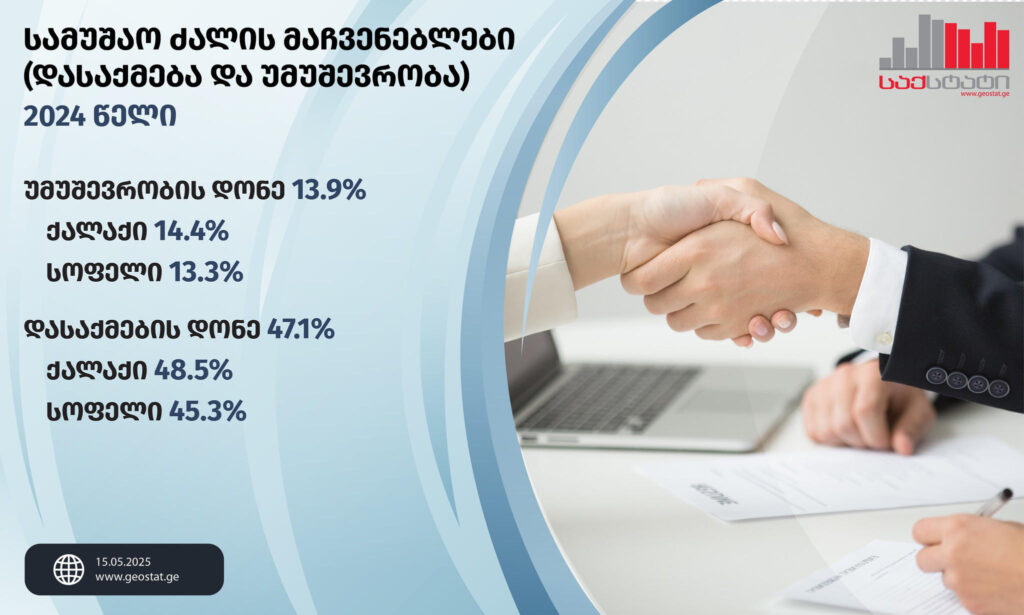 „2024 წელს სამუშაო ძალის მონაწილეობის დონე (სამუშაო ძალის წილი 15 წლის და უფროსი ასაკის მოსახლეობაში) წინა წელთან შედარებით 1.5 პროცენტული პუნქტით გაიზარდა და 54.8 პროცენტით განისაზღვრა, ხოლო დასაქმების დონე 2.6 პროცენტული პუნქტით გაიზარდა და 47.1 პროცენტი შეადგინა. სამუშაო ძალის მონაწილეობის დონე ქალაქის ტიპის დასახლებებში 1.6 პროცენტული პუნქტითაა გაზრდილი, ხოლო სოფლის ტიპის დასახლებებში – 1.4 პროცენტული პუნქტით. დასაქმების დონე გაზრდილია როგორც ქალაქის ტიპის, ისე სოფლის ტიპის დასახლებებში, შესაბამისად 3.1 და 1.9 პროცენტული პუნქტით და 48.5 პროცენტს და 45.3 პროცენტს შეადგენს.