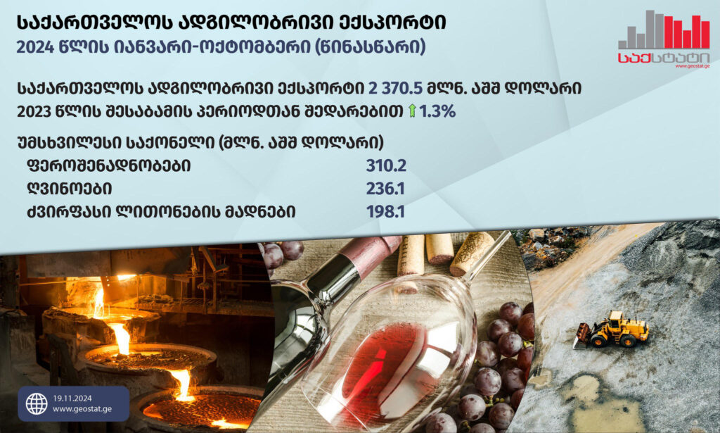2024 წლის იანვარ-ოქტომბერში ადგილობრივი ექსპორტის ათეულში პირველ ადგილზე ფეროშენადნობები არის წარმოდგენილი 310.2 მლნ. აშშ დოლარით, აღნიშნული სასაქონლო ჯგუფის წილი მთლიანი ადგილობრივი ექსპორტის 13.1 პროცენტს შეადგენს. მეორე ადგილზეა ყურძნის ნატურალური ღვინოები 236.1 მლნ. აშშ დოლარით (მთლიანი ადგილობრივი ექსპორტის 10.0 პროცენტი), ხოლო მესამე ადგილს იკავებს ძვირფასი ლითონების მადნები და კონცენტრატები, 198.1 მლნ. აშშ დოლარით (მთლიანი ადგილობრივი ექსპორტის 8.4 პროცენტი)“, – ნათქვამია ინფორმაციაში.