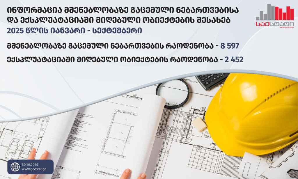 სტატისტიკის ეროვნული სამსახურის ცნობით, ოფიციალური დეკლარირებული მონაცემებით, საქართველოში 2025 წლის იანვარ-სექტემბერში გაცემულია 8 597 ნებართვა (წინა წლის შესაბამის პერიოდთან შედარებით 2.8 პროცენტით ნაკლები) 8 483.4 ათასი კვ.მ ფართობის შენობა-ნაგებობების მშენებლობაზე (წინა წლის შესაბამის პერიოდთან შედარებით 1.0 პროცენტით ნაკლები).
