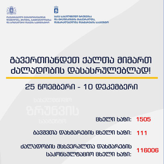 სახელმწიფო ზრუნვისა და ტრეფიკინგის მსხვერპლთა, დაზარალებულთა დახმარების სააგენტო გენდერული ძალადობის წინააღმდეგ ბრძოლის 16-დღიან მსოფლიო კამპანიას უერთდება. 25 ნოემბრიდან 10 დეკემბრის ჩათვლით, სააგენტოს წარმომადგენლები, ცნობიერების ამაღლების მიზნით, სხვადასხვა ჯგუფთან, საინფორმაციო შეხვედრებს გამართავენ. ამის შესახებ ინფორმაციას ჯანდაცვის სამინისტრო ავრცელებს.