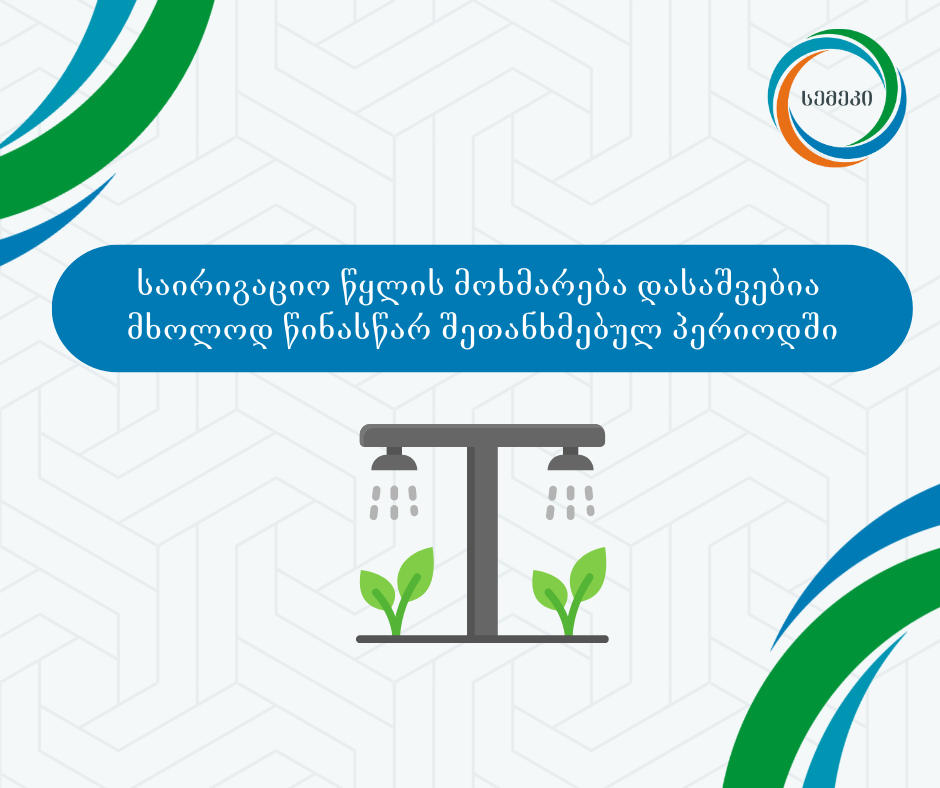 საქართველოს ენერგეტიკისა და წყალმომარაგების მარეგულირებელი ეროვნული კომისიის ინფორმაციით, საირიგაციო მიზნებისთვის წყლის მოხმარება მხოლოდ წინასწარ შეთანხმებული პერიოდითა და მოცულობით არის დასაშვები.