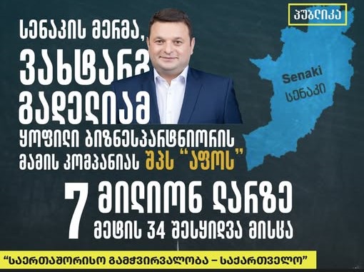 ორგანიზაციის ცნობით, შპს “აფოსთვის”, რომელსაც სენაკის მერის, ვახტანგ გადელიას ყოფილი ბიზნესპარტნიორის და მეგობრის, გიორგი აფაქიძის მამა, ამირან აფაქიძე ფლობს, ყველაზე მსხვილი შემსყიდველი სენაკის მერიაა.
