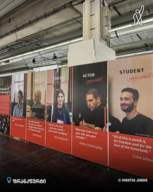 სინდისის პატიმრების ბანერები ფრანკფურტის წიგნის ბაზრობაზე