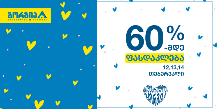 14 თებერვალი სიყვარულის დღეა. ამ დღის აღსანიშნავად გორგია მომხმარებლებს 60%-მდე ფასდაკლებას სთავაზობს. 12, 13 და 14 თებერვალს ფასდაკლება დაგხვდებათ 60 000-მდე დასახელების პროდუქციაზე.