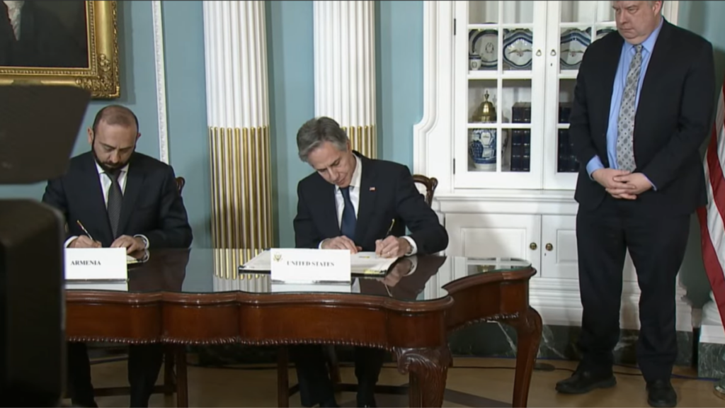 ბლინკენმა და სომხეთის საგარეო საქმეთა მინისტრმა არარატ მირზოიანმა სამშაბათს ვაშინგტონში ხელი მოაწერეს შეთანხმებას ორ ქვეყანას შორის უსაფრთხოების სფეროში თანამშრომლობის გაფართოების შესახებ. აშშ-მა და სომხეთმა ჩამოაყალიბეს „სტრატეგიული პარტნიორობის კომისია“, რომელიც შეიმუშავებს შესაძლებლობებს კავშირების გასამყარებლად თავდაცვის, ეკონომიკის, დემოკრატიული ინსტიტუტების განვითარების სფეროებში, განაცხადა ბლინკენმა შეთანხმების ხელმოწერის ცერემონიაზე.