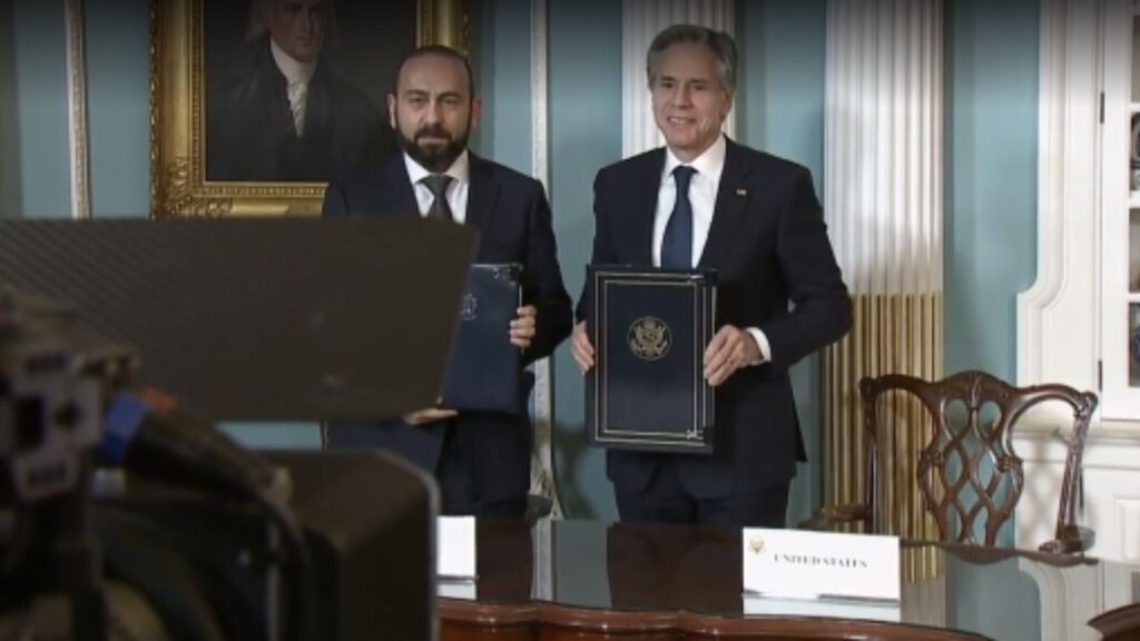 სომხეთის საგარეო საქმეთა მინისტრმა, არარატ მირზოიანმა და აშშ-ის სახელმწიფო მდივანმა, ენტონი ბლინკენმა ვაშინგტონში ხელი მოაწერეს დოკუმენტს სტრატეგიული პარტნიორობის შესახებ. შეთანხმება ითვალისწინებს თანამშრომლობის გაფართოებას ისეთ სფეროებში, როგორიცაა ეკონომიკა, უსაფრთხოება და თავდაცვა, დემოკრატია, ინკლუზიურობა და ინტერპერსონალური ურთიერთობები.