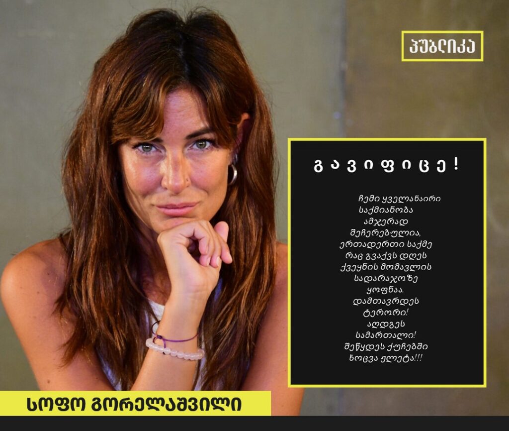 „გავიფიცე! ჩემი ყველანაირი საქმიანობა ამჯერად შეჩერებულია. ერთადერთი საქმე, რაც გვაქვს დღეს, ქვეყნის მომავლის სადარაჯოზე ყოფნაა. დამთავრდეს ტერორი! აღდგეს სამართალი! შეწყდეს ქუჩებში ხოცვა-ჟლეტა!!!”, – წერს მსახიობი და საზოგადოებრივ მაუწყებელზე „აკუსტიკის” წამყვანი სოფო გორელაშვილი.