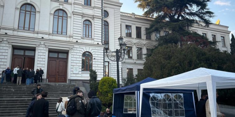 თბილისის სახელმწიფო უნივერსიტეტის პირველი კორპუსის ეზოში სტუდენტებმა კარვები გაშალეს – ახალგაზრდები ღამის გათენებას აანონსებენ.