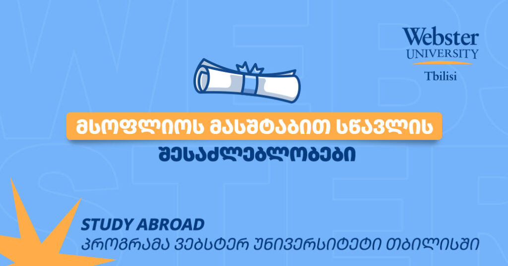 Webster University Tbilisi — ვებსტერის თბილისის კამპუსი — გთავაზობთ შესაძლებლობას, მიიღო ამერიკული ხარისხის განათლება საქართველოში, გაიარო სწავლის კურსი თანამედროვე მიდგომებით და, რაც მთავარია, გახდე გლობალური აკადემიური საზოგადოების წევრი. სტუდენტები სწავლობენ ინგლისურ ენაზე, საერთაშორისო დონეზე აკრედიტებულ პროგრამებზე, და იღებენ ამერიკულ დიპლომს, რომელიც უმაღლესი აკადემიური სტანდარტების შესაბამისად არის აღიარებული.