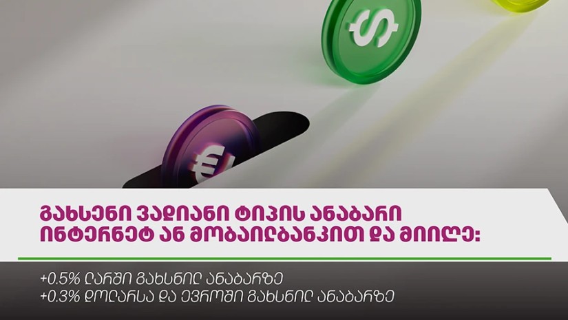 ტერაბანკი მომხმარებლებს, რომლებიც ანაბრებს მობაილ ან ინტერნეტბანკით გახსნიან, ახალ, წამახალისებელ აქციას სთავაზობს. აქციის პირობების მიხედვით, ნებისმიერი ფიზიკური პირი, რომელიც ანაბარს ლარში გახსნის, დამატებით 0.5%-ს მიიღებს, დოლარსა და ევროს შემთხვევაში კი – დამატებით 0.3%-ს.
