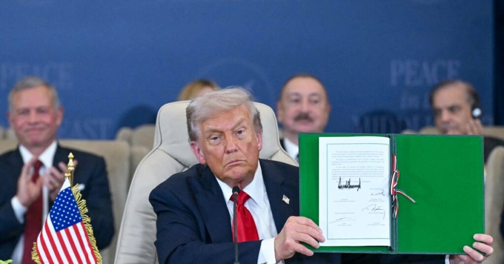 „ჩვენ ერთად მივაღწიეთ იმას, რაზეც ყველა ამბობდა, რომ შეუძლებელია“ – განაცხადა ტრამპმა ეგიპტეში გამართულ მშვიდობის სამიტზე – “ბოლოს და ბოლოს, ჩვენ გვაქვს მშვიდობა შუა აღმოსავლეთში – ძალიან იოლი გამოთქმაა, მშვიდობა შუა აღმოსავლეთში და ის მრავალი წელია გვესმის, მაგრამ არავინ ფიქრობდა, რომ საქმე აქამდე მივიდოდა და ახლა აქ ვართ“.
