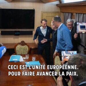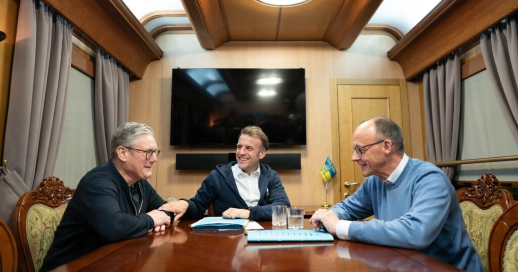 საფრანგეთის პრეზიდენტი ემანუელ მაკრონი, დიდი ბრიტანეთის პრემიერ-მინისტრი კირ სტარმერი და გერმანიის კანცლერი ფრიდრიხ მერცი კიევში 9 მაისს გაემგზავრნენ. მატარებელში გადაღებულ ვიდეოკადრებში მაგიდაზე ჩანს დაჭმუჭნილი ქაღალდის ხელსახოცი, რომელსაც შემდეგ ჯიბეში იდებს პრეზიდენტი მაკრონი.