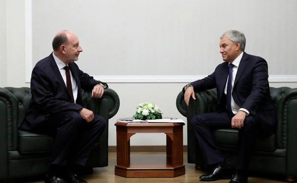 უკრაინამ დაასანქცირა შარლ დე გოლის შვილიშვილი, პიერ დე გოლი, რუსეთის ხელისუფლებასთან თანამშრომლობისთვის. ფოტოზე პიერ დე გოლი ეკურკურება დუმის სპიკერ ვოლოდინს.