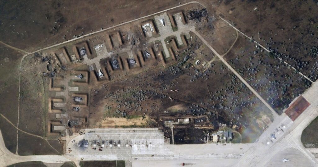 რუსეთის მიერ ანექსირებულ ყირიმში მდებარე ეს სამხედრო აეროდრომი 2022 წლის აგვისტოდან რამდენჯერმე იყო უკრაინის თავდაცვის ძალების სამიზნე.