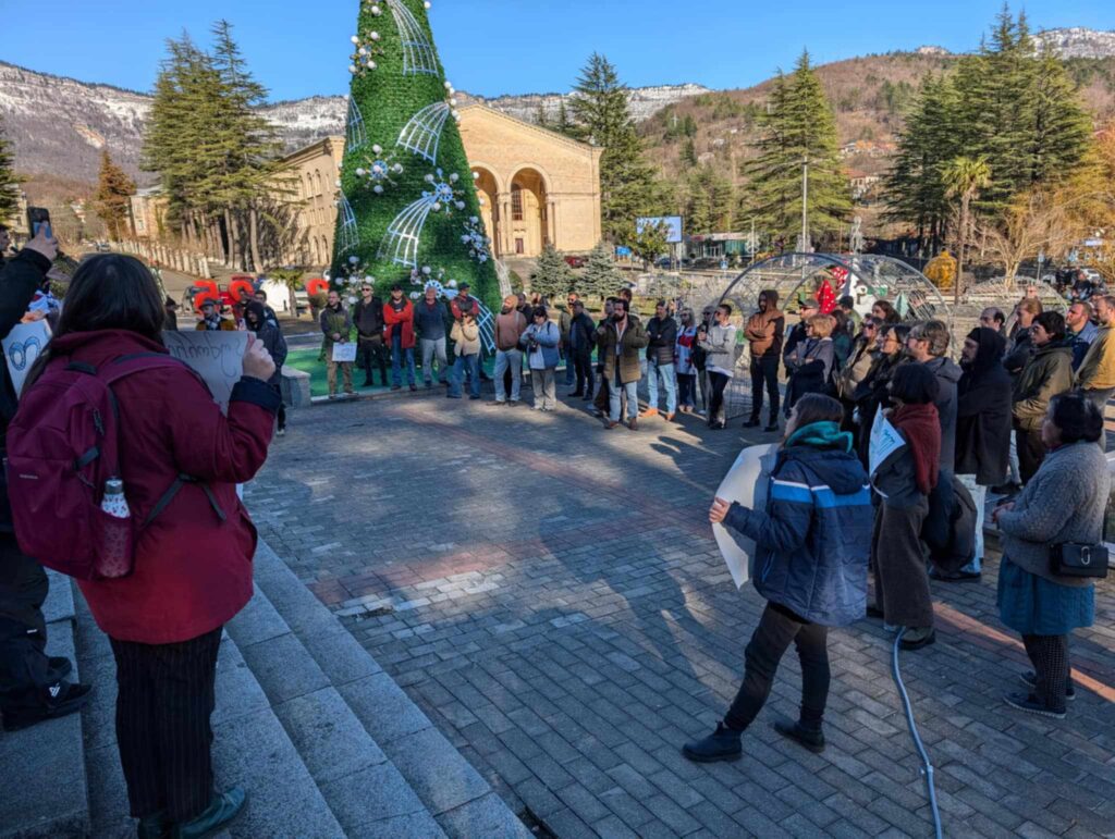 „38 ადამიანი რამდენიმე დღის წინ გაათავისუფლეს სამსახურიდან პოლიტიკური მოსაზრებების გამო და სწორედ ამის გასაპროტესტებლად შევიკრიბეთ“, – ამბობს უფლებადამცველი ვახუშტი მენაბდე. აქციაზე სიტყვით გამოვიდნენ ის მაღაროელებიც, რომლებიც ამბობენ, რომ „საქნახშირიდან“ პოლიტიკური მოტივით გაათავისუფლეს.