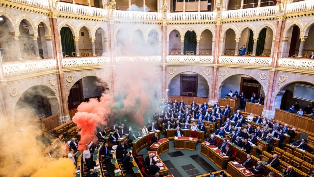 კენჭისყრამდე ოპოზიციური პარტიის, „მოძრაობა მომენტუმის“ წარმომადგენლებმა პლენარული დარბაზი აავსეს ფერადი კვამლის ღრუბლებით, საბჭოთა ჰიმნს უკრავდნენ და დარბაზში მიმოფანტეს ფოტოები, რომლებზეც გამოსახული იყო, როგორ კოცნიდნენ ერთმანეთს უნგრეთის პრემიერ-მინისტრი ვიქტორ ორბანი და რუსეთის პრეზიდენტი ვლადიმირ პუტინი.