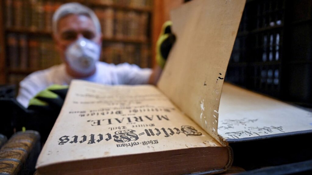 უნგრეთში, უძველეს ბიბლიოთეკაში, ათეულობით ათასი წიგნი ჩამოაქვთ თაროდან, რათა ისინი ხოჭოების შემოსევას გადაარჩინონ.