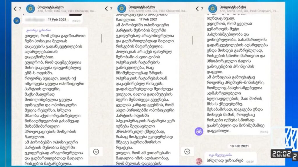 ტელეკომპანია „ფორმულა“ „ქართული ოცნების“ პოლიტსაბჭოს 2021 წლის მიმოწერების სქრინებს ავრცელებს, სადაც ჩანს თუ როგორ წყდება “ერთიანი ნაციონალური მოძრაობის” მაშინდელი თავმჯდომარის, ნიკა მელიას დაკავების საკითხი.