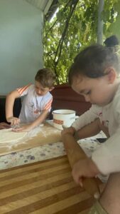 ვგრძნობდი, რომ იქ ყოფნით ძალიან ბედნიერი ვიყავი. დედა მეუბნებოდა რომ ქიზიყი იმიტომ მოგეწონა რომ ეს ადგილის დედის ყივილიაო, მე კი ვერ მივხვდი მაგრამ, ალბათ, ასეა. ხო, კიდევ, ბაბულიას მეგობრები მოვინახულე – მზია (ხატიაშვილი) ბებიამ ხინკლის გაკეთება მასწავლა, ხორციანის გარდა კარტოფილის ხინკალი, გაგისინჯავთ? არც მე, ჩემს ბაჯის (ხათუნა დეიდას ეძახის ასე) უყვარს და ვისწავლე რომ გავუკეთო. ოლიკო (კიკილაშვილი) ბებიამ თათარა დამახვედრა და ოცი ჩურჩხელა ამოვავლე და ამერიკაში წამოვიღე, მერე ჩემს მეგობრებს დავურიგე, ჯერ ვერ გაიგეს რა იყო, შუაში ძაფი რომ ქონდა სანთელი ეგონათ (იცინის), მერე აუხსენი და ძალიან მოეწონათ. სკოლაში რომ გვექნება “ეროვნული დღეები” – იქ გამოვფენ და ყველას ვასწავლი და ავუხსნი თუ რა არის ჩურჩხელა. ჯულიეტა (წივილაშვილი) ბებიამ, ბაღჩაში წამიყვანა და სიმინდი, პომიდორი, კიტრი მოვკრიფე, უგემრიელესი იყო. ლია ბებიამ (ქადაგიძე) ჟოლოს ბაღის მოსაკრეფად დაგვპატიჟა. კიდე გავიცანი ნელი (შოშიაშვილოი) ბებია და ანა (ჰუსაინოვა) ბებია, ისინი დედას ნათლიები არიან. დედას ასწავლიდნენ სკოლაში. დედა ყველას მასწავლებელს ეძახის, მე კი ბებიებს ვეძახი, ბაბულიას მეგობრები არიან. მათი შვილიშვილებიც გავიცანი, ვითამაშეთ კიდეც. ზოგი ჩემზე პატარაა, ზოგი დიდია. მზია ბებოს პატარა სანდრა შემიყვარდა ძალიან.