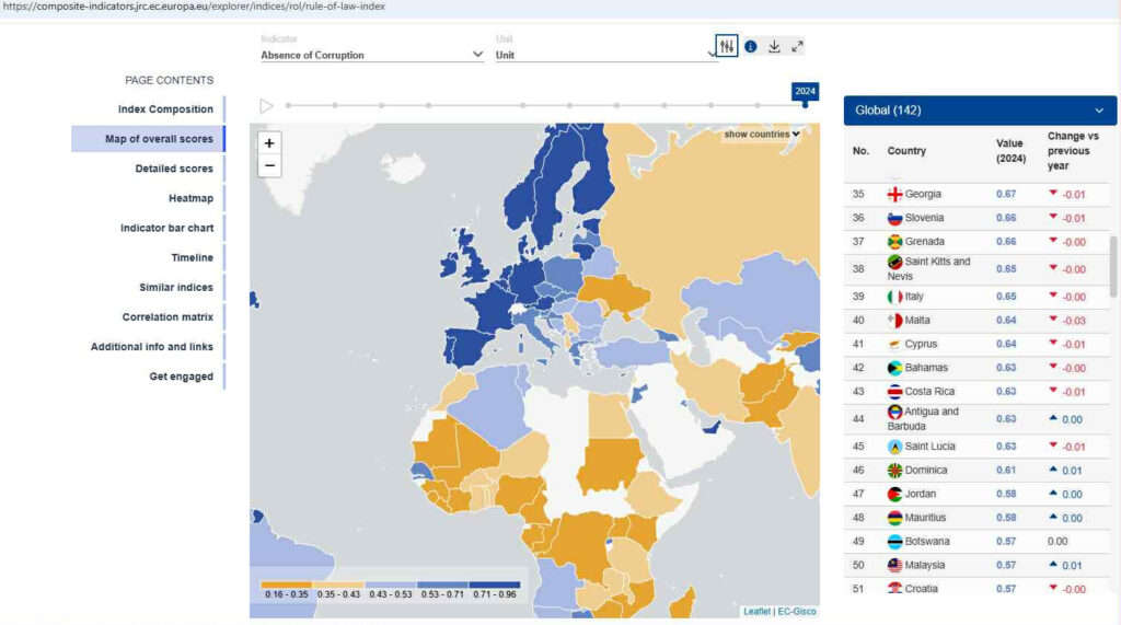 ევროკომისია, მსოფლიო მართლმსაჯულების პროექტის კანონის უზენაესობის გამოკვლევის ფარგლებში, კორუფციის არარსებობის ინდექსს აქვეყნებს, რომლის მიხედვითაც საქართველომ შეფასების 100%-იანი სისტემით 67% მიიღო, მსოფლიოში 35-ე ადგილზე გავიდა და ევროპის საუკეთესო ოცეულში მოხვდა.