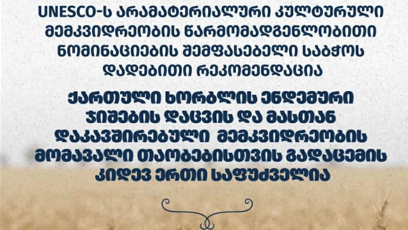 UNESCO-ს არამატერიალური კულტურული მემკვიდრეობის წარმომადგენლობითი ნომინაციების შემფასებელი საბჭოს მიერ „ქართული ხორბლის კულტურა: ტრადიციები და რიტუალები“ დადებითი რეკომენდაცია გაიცა. საბოლოო განხილვა UNESCO-ს არამატერიალური კულტურული მემკვიდრეობის დაცვის მთავრობათაშორისი კომიტეტის მე-20 სესიაზე შედგება, რომელიც 8-13 დეკემბერს ინდოეთში, დელიში გაიმართება.