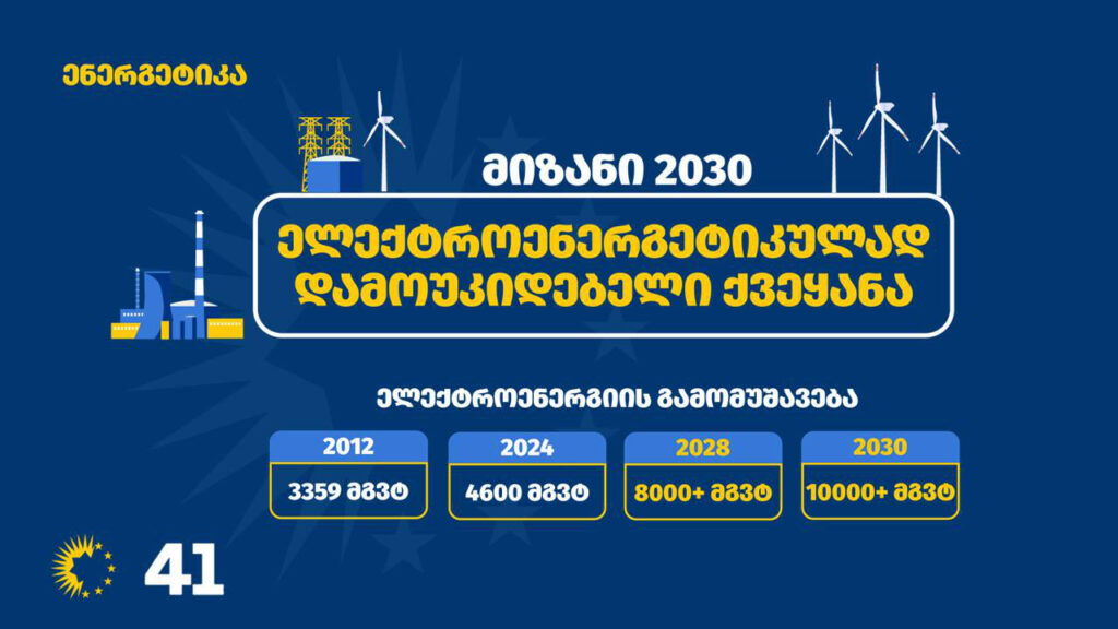 „2030 წელს საქართველო პირველად გახდება ელექტროენერგეტიკულად დამოუკიდებელი ქვეყანა. ეს ნიშნავს, რომ ელექტროენერგიაზე ჩვენი მოთხოვნის დაკმაყოფილება ენერგიის იმპორტის გარეშე შეგვეძლება. ბოლო 12 წლის განმავლობაში აშენდა: 63 ჰესი, 2 თბოელექტროსადგური, 1 ქარის ელექტროსადგური“, – განაცხადა პაპუაშვილმა.