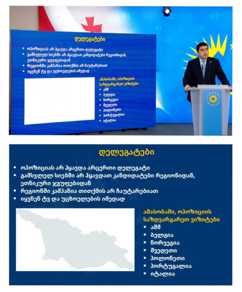 „თუ დავუჯერებთ ფსევდორელიგიური ფანატიკოსების აღქმებს და ტელევიზორებს, შემდეგ სლაიდზე, რომელზეც ჩანს, რომ ოპოზიციას არცერთ ოლქში დელეგატი არ დაუსახელებია, საქართველო სრულად აღმიგვია პირისაგან მიწისა