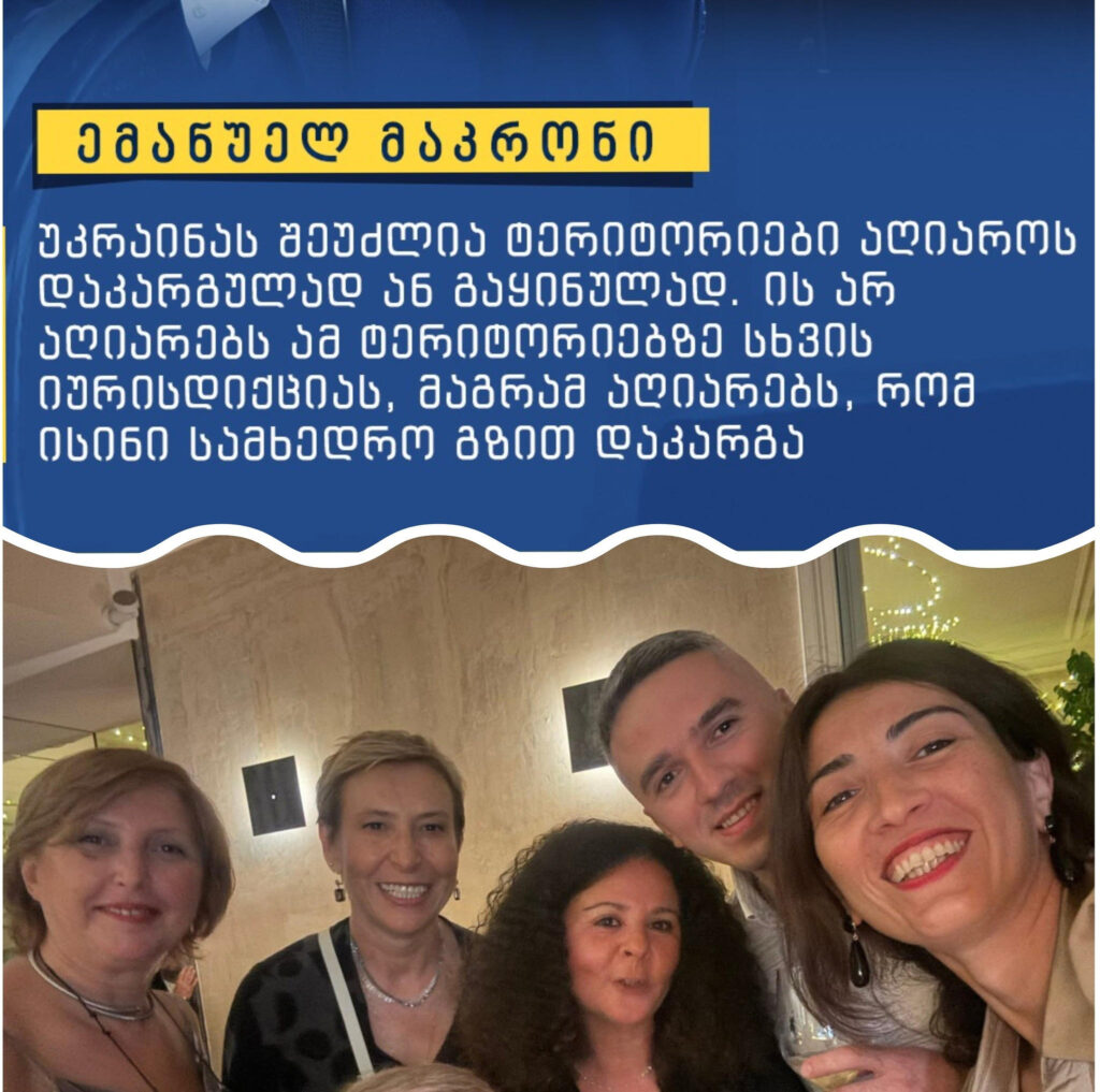 „ამ ბანერზე, ზემოთ, საფრანგეთის პრეზიდენტის, ემანუელ მაკრონის დღევანდელი განცხადებაა, სადაც ის უკრაინა–რუსეთის ომიდან გამოსავალს უკრაინის მხრიდან საკუთარი ტერიტორიების დათმობაში ხედავს.