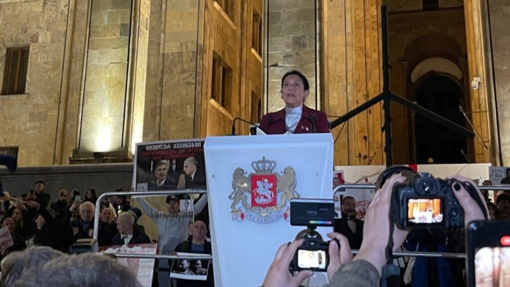 ამ წუთებში აქციაზე შეკრებილებს მიმართავს სალომე ზურაბიშვილი, რომელიც წინა კვირას ბალტიის ქვეყნებში – ესტონეთში, ლატვიასა და ლიეტუვაში – იმყოფებოდა.